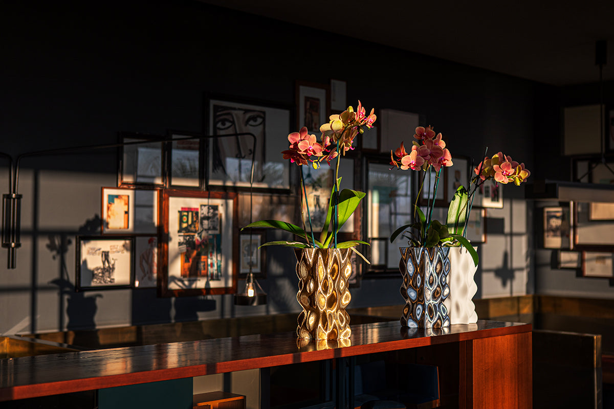 Vasi collezione Flow, Aladin, Dalì, Sinuosa, Stripes, super versatili, oggetti di design moderno, noti per la loro forma e la capacità di creare giochi di luce e ombre, possono essere utilizzati in diversi modi, come centro tavola, riempilo con fiori freschi o rami per un tocco di eleganza; con luci, per creare un'atmosfera magica; come decorazione minimalista: lascialo vuoto per impreziosire un angolo di casa.
